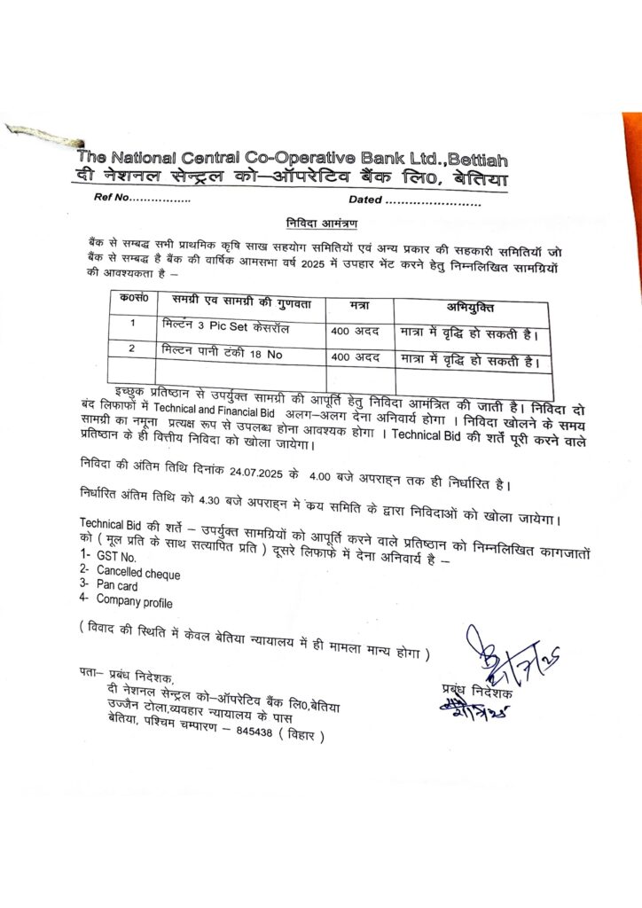 Tender For Gift Material AG Meeting F.Y.25-26 Tender For Hire Agency Document 114Download Date of Opening Tender Tender Through ICDP YOJNA Processing Unit BidDownload